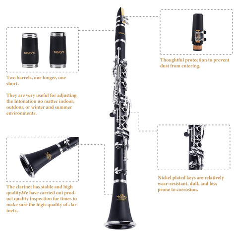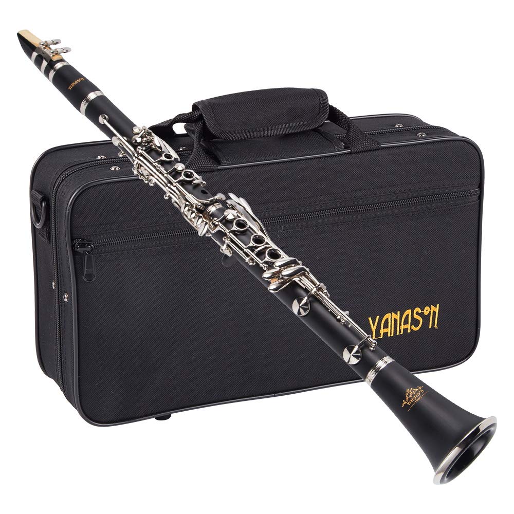 YANASON Bb clarinet for beginners, Bb nickel-plated 17-keys clarinet, suitable for students, professionals, school bands with Hard Foam Case,Barrels*2,Pads*8,Stand, Cleaning Kit,Gloves,Strap,Reeds*8