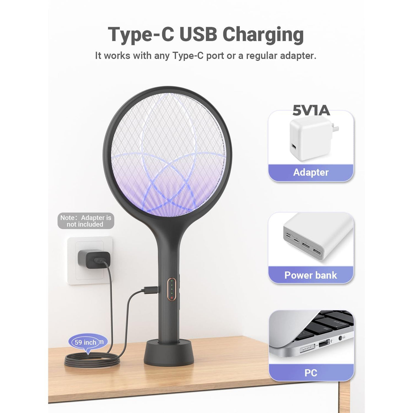 - ( EASY TO USE) This fly zapper racket is easy to clean after use it. The Mosquito body will not be caught inside. A 5V/1A Adapter is recommended (Not Included). Higher current input may cause potential damage to the charging system, if do not have it? Note: Support from YISSVIC to get a free available adapter