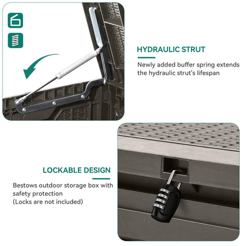 - User-Friendly Design: These outdoor deck boxes are equipped with hydraulic struts for smooth and safe operation, as well as dual built-in side handles, making it easy to move around as needed