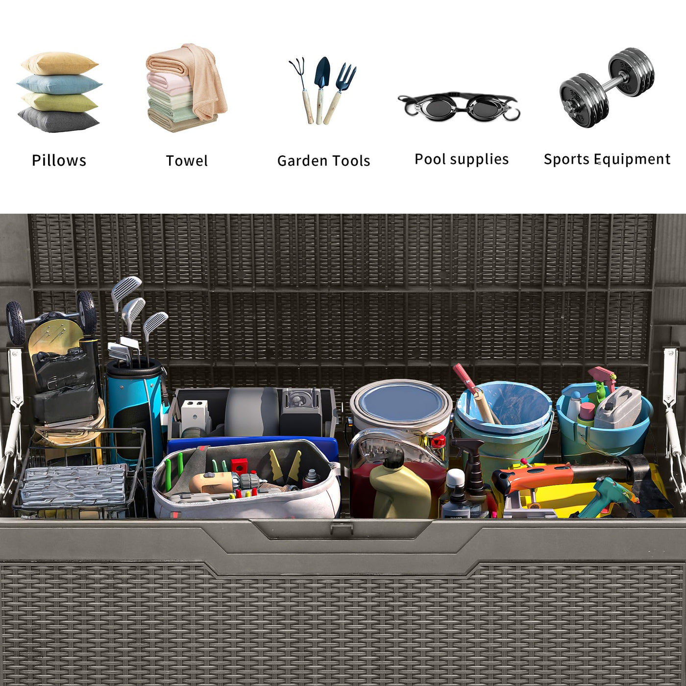 - Multi-Purpose Use: Ideal for both indoor and outdoor storage needs, this plastic deck box accommodates patio cushions, gardening tools, pool gear, and other items to meet your needs; The deck box with lock feature offers enhanced security