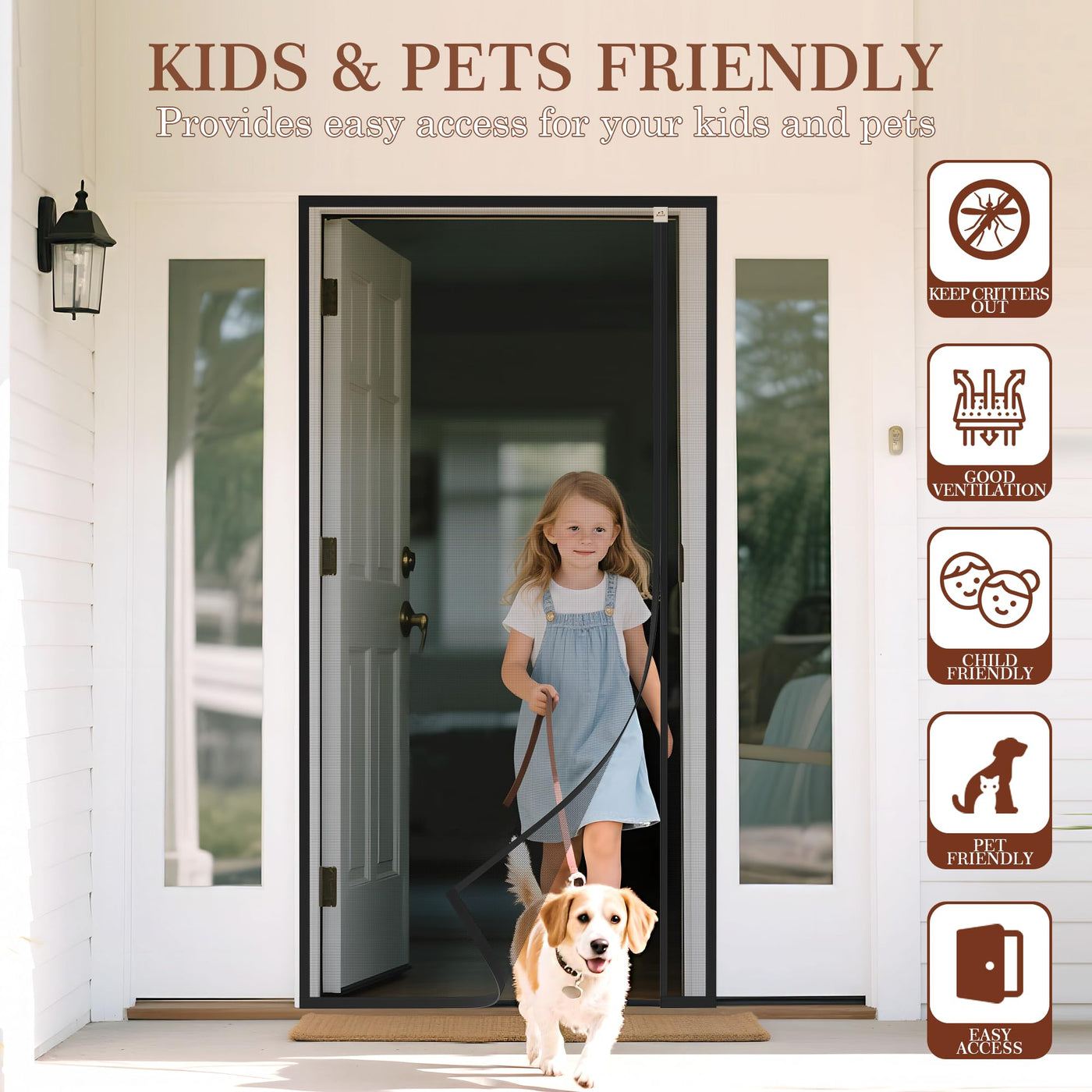 - CONVENIENT SCREEN DOOR SOLUTION: With this magnetic screen door, you can bring fresh air in to your home everyday, and still keep the obnoxious elements out! It is sturdy and tear resistant so you can feel safe and secure with your kids walking through it. Plus, it is a pet friendly mesh screen that can withstand frequent use. It makes a thoughtful idea to pet parents who want a safe and affordable solution for easy pet entry indoors and outdoors