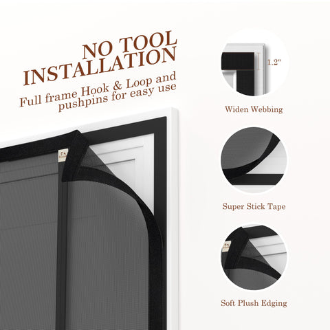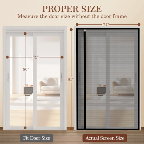 - PACKAGE AND SCREEN SIZE: The package includes a magnetic screen, plus a roll of hook&loop, a pack of push pins and instruction manual, ensures quick and easy installation and removal. The screen mesh size is 74" width x 81" height, fits your door size 72" x 80"