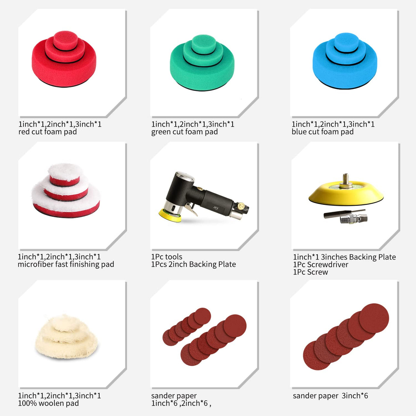 - ▲ High quality professional air random orbital sander with 15 pcs buffing pads, 18 pcs sandpapers, 3 pcs backing plates, 1 pc screw and 1 pc screwdriver.