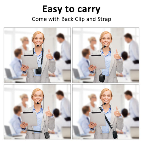 - Portable Voice Amplifier Compact size (4. 1 x 1. 4 x 3. 4 inches) and light weight (0. 36 lb.). You can use the back clip to fix it on your belt or pocket. You can also use waistbelt to tie it around your waist or hang it on your neck
