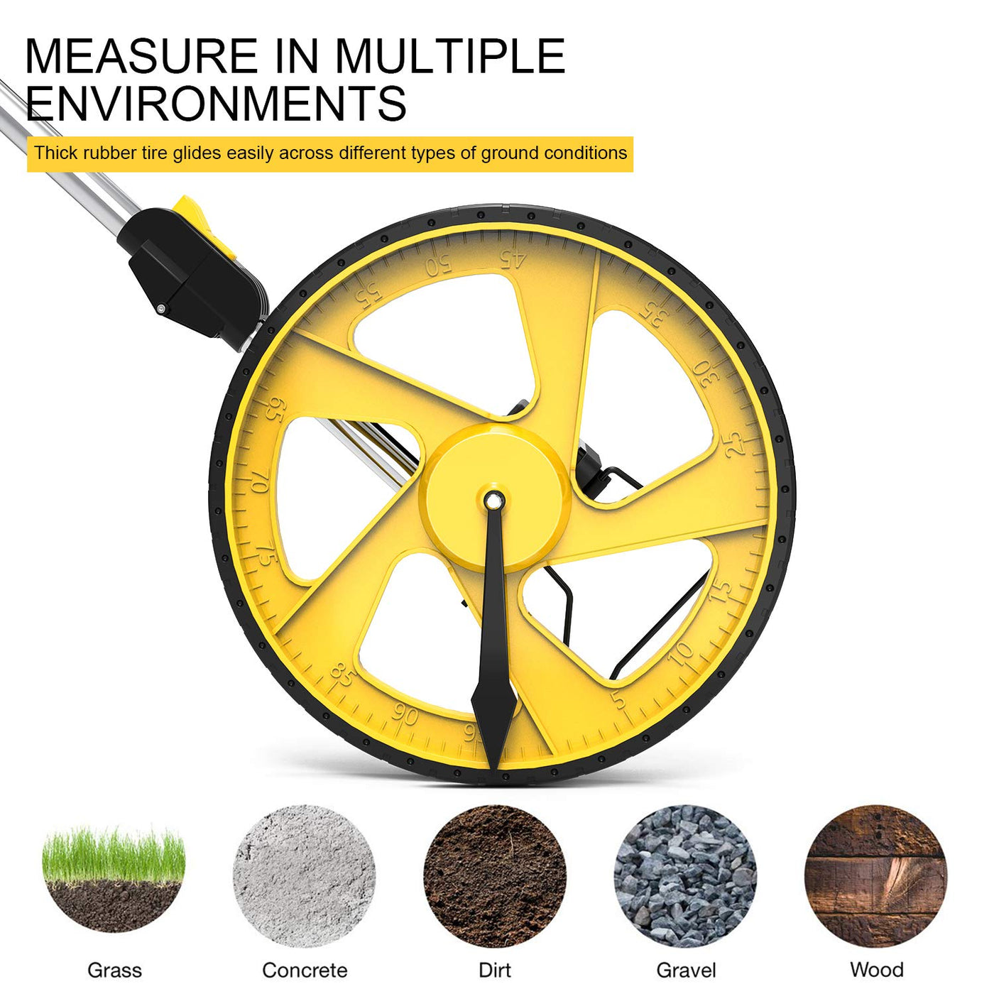 - đăDifferent Environmentsă â With sturdy, durable rubber, walking roller wheel is equipped for all environments â grass, concrete, gravel, dirt and more! STURDY â Walking wheels are great for professional work projects or school activities. Extremely accurate makes it extremely useful to measure the boundary lines of your property and neighborhood.