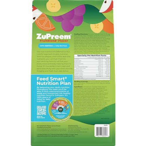 - FEED SMART NUTRITION PLAN: By balancing your bird’s nutrition throughout the week you’ll be able to limit overconsumption of seeds and incorporate the healthy nutrition found in ZuPreem; It’s 100% nutrition for 100% peace of mind