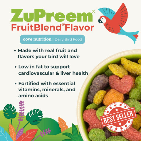 Details: Give your feathered friend a fun, flavorful, and balanced diet with ZuPreem FruitBlend for Parrots & Conures. Specially designed for African Greys, Conures, Amazons, Cockatoos, and other medium to large pet birds, this premium parrot food features colorful, fruit-shaped pellets packed with essential vitamins, minerals, and antioxidants to support strong immunity, healthy digestion, brain function, vibrant feathers, and beak strength. The variety of shapes, colors, and fruit flavors encourages foraging instincts and natural eating behaviors, making mealtime exciting, nutritious, and engaging. Formulated as a complete and balanced daily diet, FruitBlend bird food is the perfect main meal and pairs beautifully with your bird’s favorite fresh foods, nuts, seeds, and foraging treats. Recommended by avian veterinarians and trusted by bird owners, this high-quality bird food helps parrots and conures stay active, healthy, and full of energy. Whether you’re feeding an African Grey, Amazon, Cockatoo, or Large Conure, give them the best nutrition for a happy and thriving life!