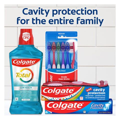 - Colgate Cavity Protection fluoride toothpaste fights cavities