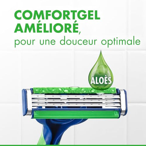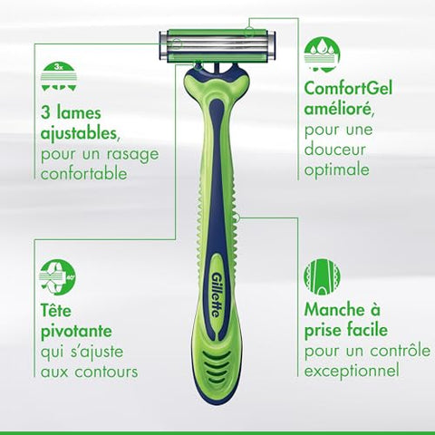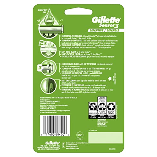 Details: Looking for a men's disposable razor that can get you up to 10 comfortable shaves? Gillette's Sensor3 Sensitive disposable razors do just that thanks to its 3 chromium-coated, skin sensing blades and a 40 degree pivoting head that automatically adjusts to the skin's surface to give a close, smooth and comfortable shave. Additionally, the skin-guard fins have five elastomer fins that gently stretch the skin to create a smooth, even surface for an optimal shave. Each razor can last up to 10 comfortable shaves. Sensor3 disposable razors for men feature an enhanced Lubrastrip with water activated Comfortgel technology for ultra-gentle shaving on your sensitive skin. Complete with an ergonomic shaped non-slip rubber handle for great control and maneuverability and easy rinse blades for 100% better rinsing (vs Sensor2 Plus disposable razors). See why Gillette Sensor3 Men's Disposable razor is the world's #1 selling 3 blade disposable razor*. For best results, use with your favorite Gillette shave gel, cream or foam. *Based on Nielsen sales data among 3 bladed male disposable razors.