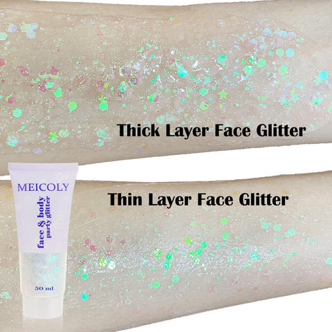 - Easy to Use --- MEICOLY face glitter gel is formulated with self-adhesive material that is sticky, so you don't need to use glue when using it,save your makeup time.Great face glitter for running,giving you a sparkle look even at a long lasting running event.MEICOLY face and body glitter can be used directly in the body wherever you want to decorate,perfect for rave outfit accessories. Apply to hair and body with fingertips or brush