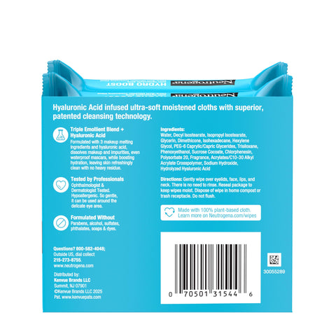 - Two 25-count packages of Neutrogena Hydro Boost Ultra-Soft Micellar Cleansing Wipes, formulated with hyaluronic acid and makeup melting ingredients, gently and effectively eliminate up to 99% of makeup and oil while also boosting hydration