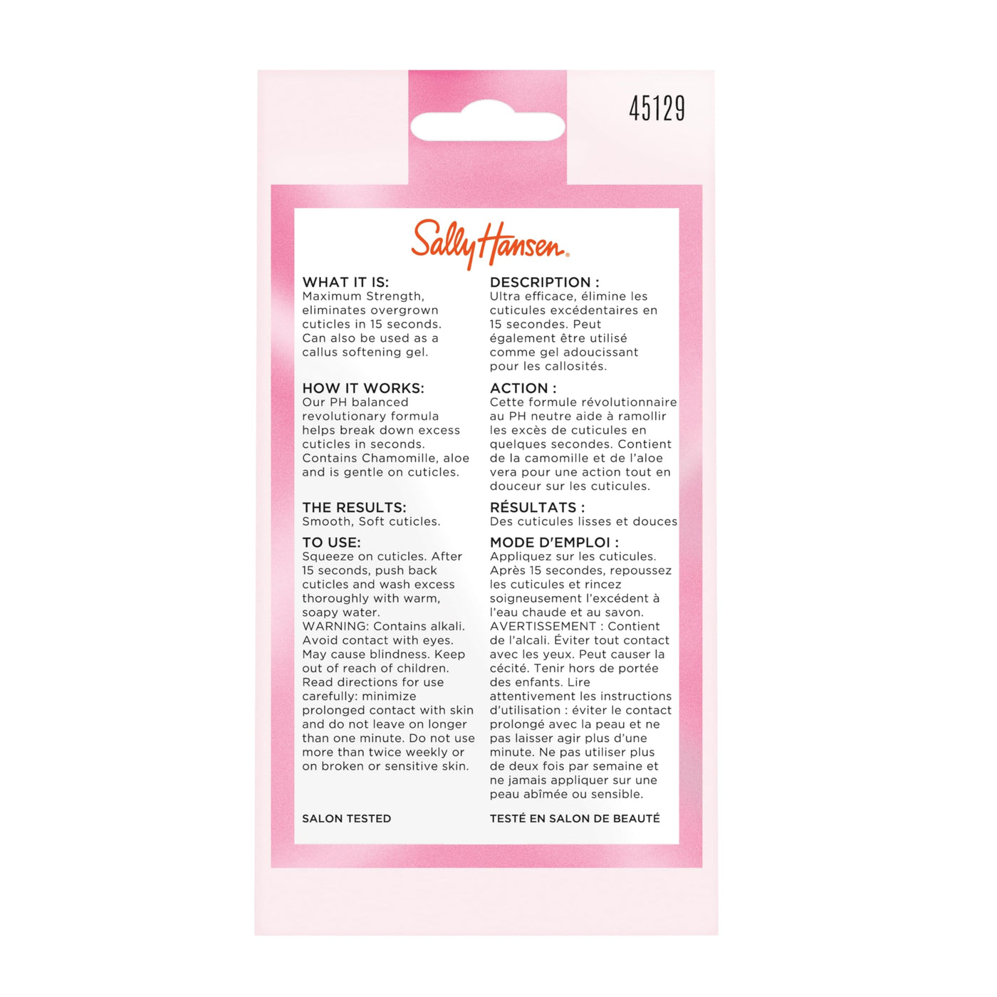 Details: Say goodbye to stubborn cuticles with Instant Cuticle Remover from Sally Hansen. Ultra-fast, it helps break down excess cuticles in just 15 seconds. Our revolutionary gel formula features Chamomile and Aloe and is gentle on cuticles. An intensive cream that targets rough, ragged cuticles and dry, weak nails.