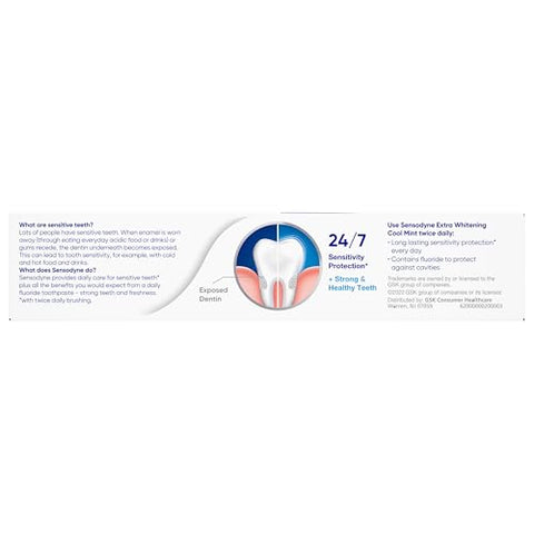 Details: Sensodyne Extra Whitening Cool Mint Sensitive Teeth Whitening and Cavity Prevention Toothpaste is an SLS free toothpaste that helps remove stains for a whiter smile as it provides daily protection for sensitive teeth. This potassium nitrate and sodium fluoride toothpaste helps whiten teeth by polishing away surface stains while working deep inside teeth to build soothing protection around the nerves, decreasing sensitivity in as little as two weeks with twice daily brushing. Sensodyne Extra Whitening Cool Mint toothpaste offers all the anticavity and fresh breath benefits of regular Sensodyne toothpaste and comes with a formulation that reduces tartar build-up for cleaner, smoother and healthier teeth. Enjoy 24/7 sensitivity protection and relief using this whitening sensitive toothpaste in the morning and the evening. Get lasting protection from tooth sensitivity with Sensodyne, the #1 dentist recommended toothpaste brand for sensitive teeth.