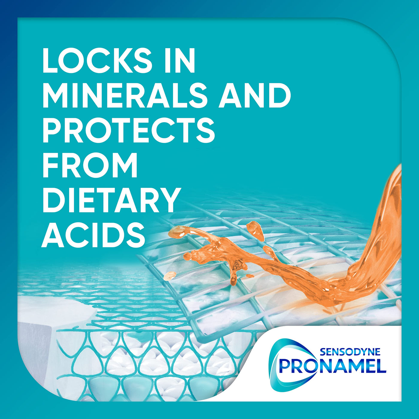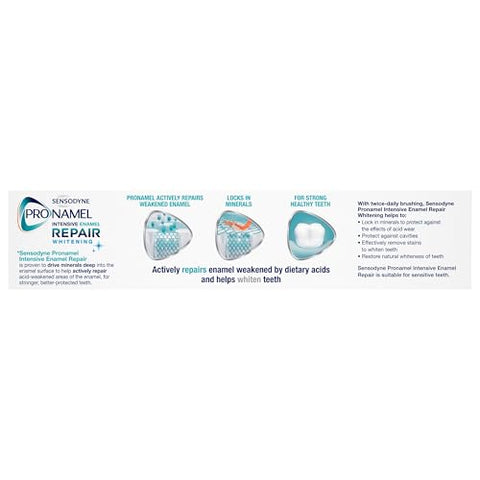 Details: Sensodyne Pronamel Intensive Enamel Repair Toothpaste for Sensitive Teeth and Cavity Protection features an advanced enamel care formulation proven to help actively repair and protect tooth enamel while effectively removing stains to help restore teeth to their natural whiteness. Many of the foods and drinks you enjoy contain acids that can wear away the hard enamel coating of your teeth. Developed with potassium nitrate and sodium fluoride, this sensitive toothpaste strengthens and rehardens weakened enamel and provides lasting relief (1) from sensitivity. Whether it�s a sharp shock or a twinge of pain from hot or cold drinks and food, Sensodyne Pronamel toothpaste makes it easier to manage your sensitive teeth. This superior strengthening of enamel also helps prevent cavities, whiten teeth and freshen breath with a refreshing arctic breeze flavor. The convenient four-pack keeps you stocked with enamel toothpaste. For sensitivity protection, apply this enamel protection toothpaste in a 1-inch strip on your toothbrush, and brush twice a day every day. Get lasting protection from tooth sensitivity with Sensodyne Pronamel. (1) With twice daily brushing.