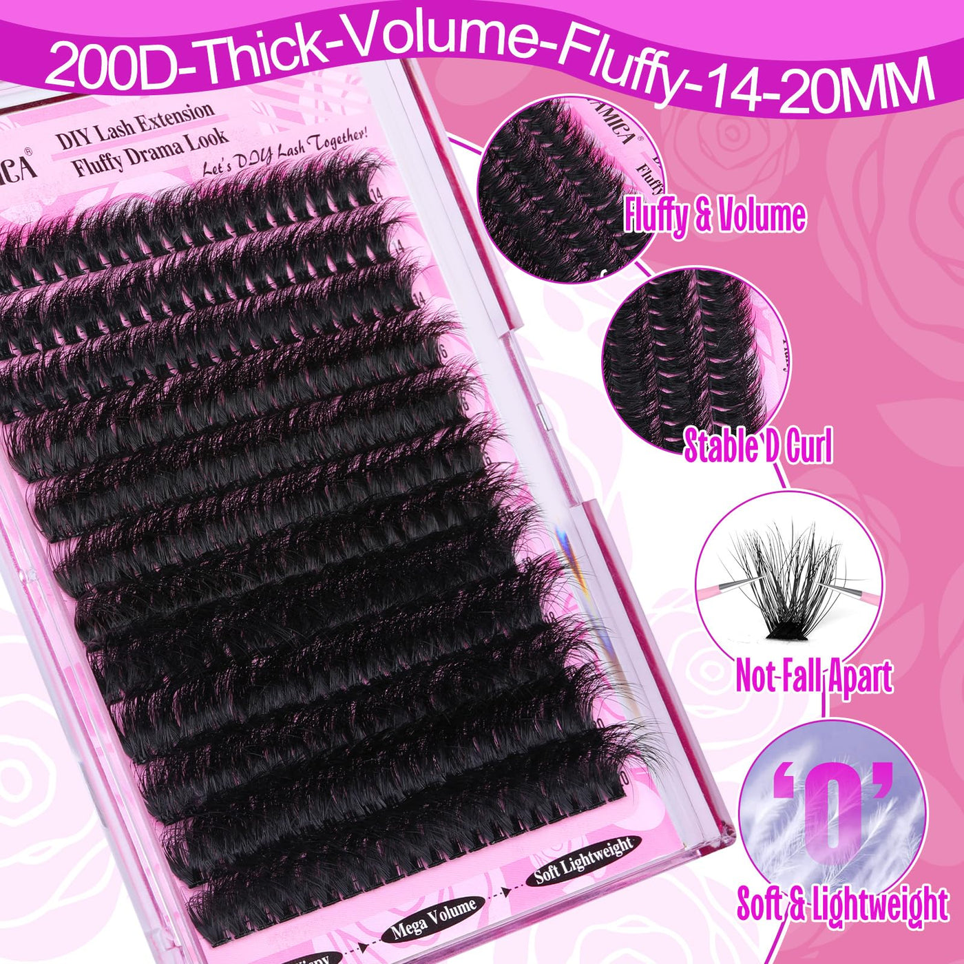 Yawamica Fluffy Lash Clusters Thick 200D Volume Eyelash Clusters 14-20mm Wispy Individual Lashes D Curly Cluster Eyelash Extensions 240pcs DIY Lash Extension for Beginners
