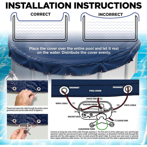 - Effortless Installation: Includes clear and comprehensive installation instructions, making the process quick and easy. Additionally, we provide a heavy-duty, vinyl-coated cable and tightening winch, secured by rip-proof metal grommets spaced 30 inches apart, ensuring a secure and snug fit for optimal protection of your pool.