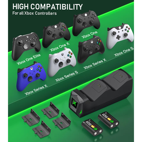 - Compatible for All Your Xbox Controller: The controller charger dock for Xbox one batteries pack is designed for Xbox One, Xbox One X, Xbox One S, Xbox One Elite, Xbox Series X, Xbox Series S. The charger and battery kit for Xbox controller is equipped with 4 controller battery back cover, 2 for X1/X/S/Elite and 2 for Xbox Series X and Xbox Series X. Meet players' a series of Xbox one controllers to charge needs