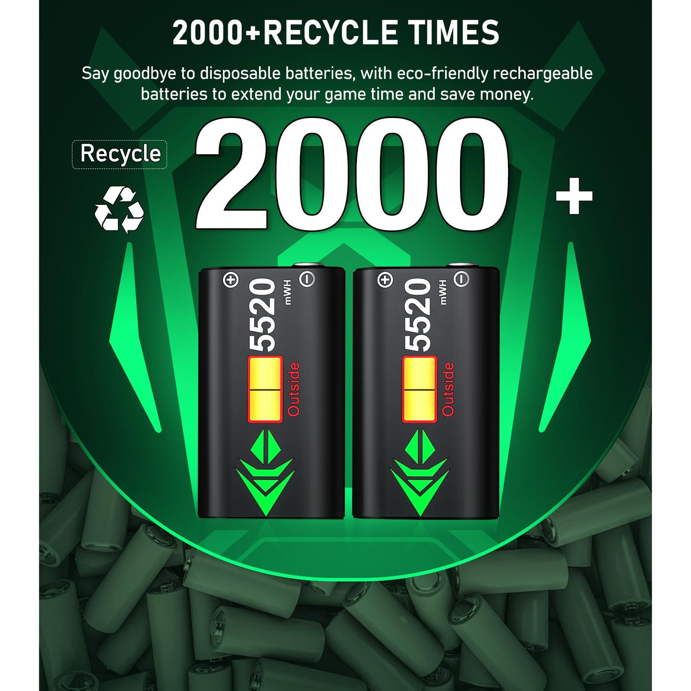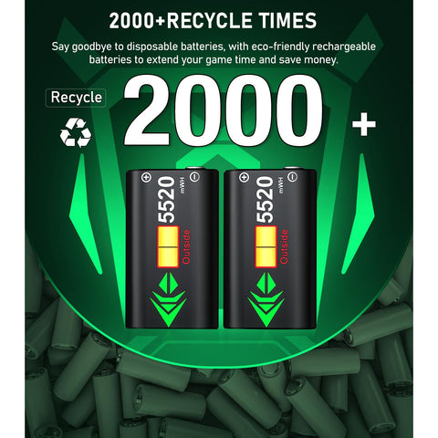 - 2000+ RECYCLE TIMES OF RECHARGEABLE BATTERY: How many times have you had to interrupt your game because the disposable batteries suddenly run out, and how much money it would save to say goodbye to using AA batteries?Our eco-friendly 5520mWh rechargeable battery pack for Xbox one can be recharged over 2000 times, and there are 2 charging ports and 2 batteries, you can always prepare for your game. Say goodbye to the disposable batteries to save your money and time