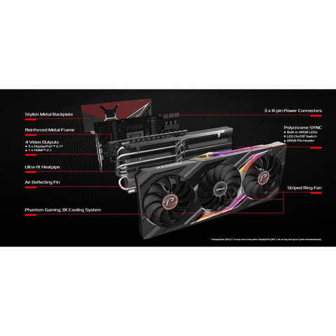 Details: Clock: GPU / Memory Boost Clock*: Up to 2615MHz / 20Gbps Game Clock**: 2455MHz / 20Gbps Key Specifications AMD Radeon™ RX 7900 XTX GPU 24GB GDDR6 on 384-Bit Memory Bus 96 AMD RDNA™ 3 Compute Units (With Rt+Ai Accelerators) 96MB AMD Infinity Cache™ Technology PCI® Express 4.0 Support 3 x 8-pin Power Connectors 3 x DisplayPort™ 2.1 / 1 x HDMI™ 2.1 Key Features Polychrome SYNC Phantom Gaming 3X Cooling System Striped Ring Fan Reinforced Metal Frame Stylish Metal Backplate 0dB Silent Cooling