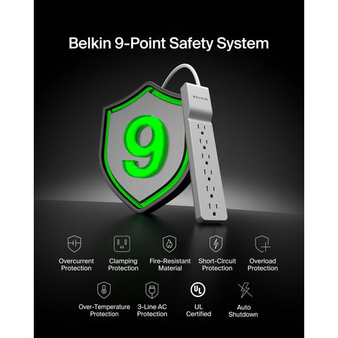 - 6-POINT SAFETY SYSTEM: This Belkin power strip surge protector has Fire resistant material, Overcurrent protection, Overload protection, Short circuit protection, Clamping protection, and 3-line AC protection.
