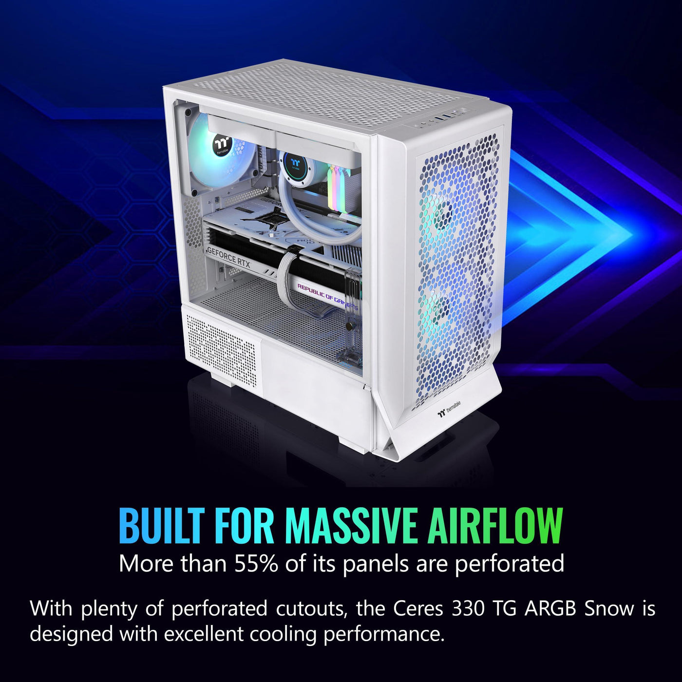 Details: Ceres 330 TG ARGB Snow Mid Tower Chassis is an ATX case that supports both ASUS and MSI Hidden-Connector motherboards and comes with two CT140 ARGB Sync PC Cooling Fans White pre-installed at the front and one CT140 PC Cooling Fan White pre-installed at the rear. Its RGB lighting can be controlled by motherboard software from ASUS, GIGABYTE, MSI, and ASRock. More than 55% of its panels are perforated to provide a large amount of airflow. Besides, up to five 140mm fans or seven 120mm fans can be installed in the chassis, and one 360mm radiator can be placed at the front and up to one 280mm radiator can be placed at the top of the chassis to provide countless hardware options.