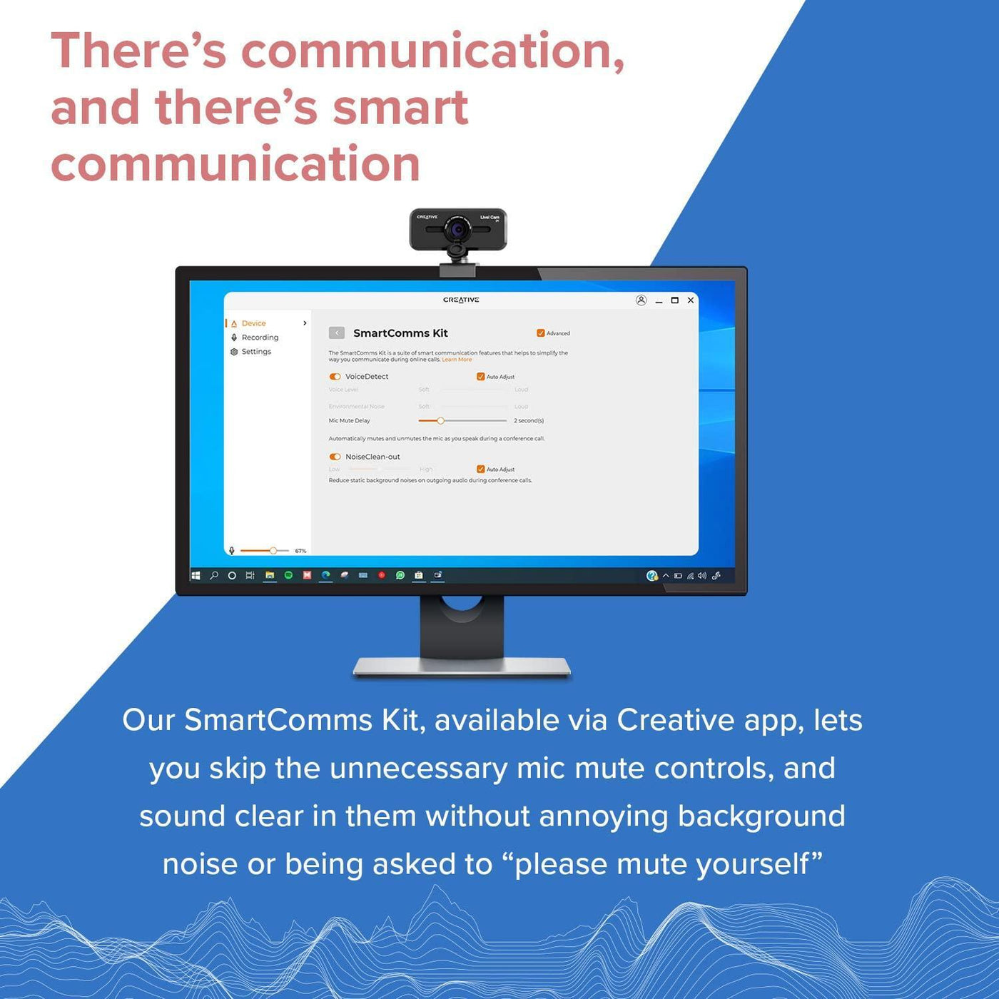 - DUAL BUILT-IN MICS WITH SMART COMMS FEATURES - With two built-in omni-directional digital microphones, your voice gets picked up clearly and accurately, and you will come off sounding natural and realistic; almost as natural as talking face-to-face. It also comes with our SmartComms Kit, a suite of smart communication features, including NoiseClean-out that removes unwanted background noise, via the downloadable Creative app for Windows