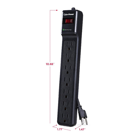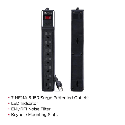 Details: The Essential Surge Protector CSB706 offers vital surge protection for common home and office devices such as computers and electronics. It prevents spikes in energy caused by storms and electrical power surges from reaching your electronic equipment. The CSB706 provides 1800 Joules of protection, 7 outlets, a 6 ft. power cord. Features of the CSB706 include metal oxide varistor (MOV) technology, an EMI/RFI noise filter, keyhole mounting slots, and impact-resistant casing. This surge suppressor comes with a Limited Lifetime Warranty and a Connected Equipment Guarantee.