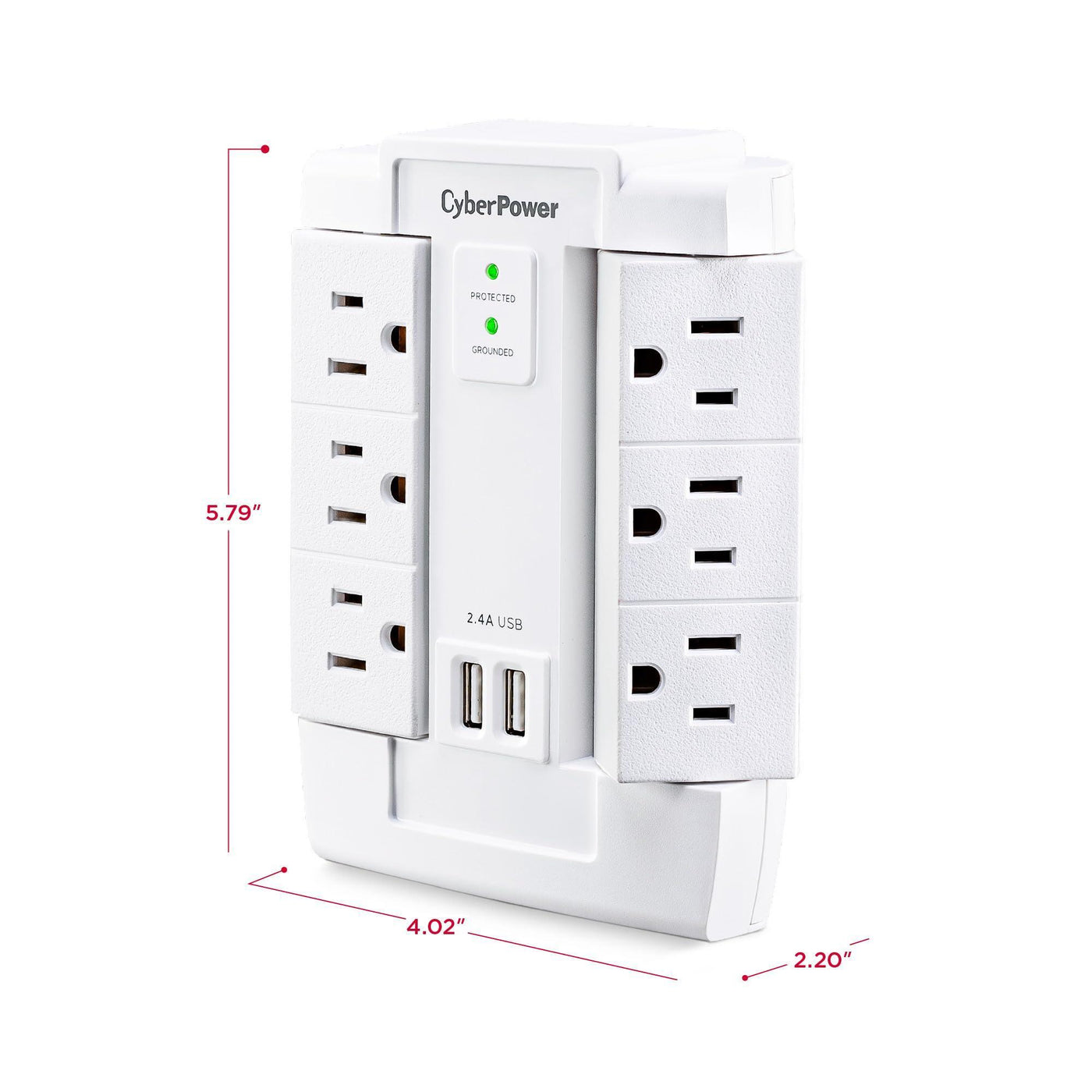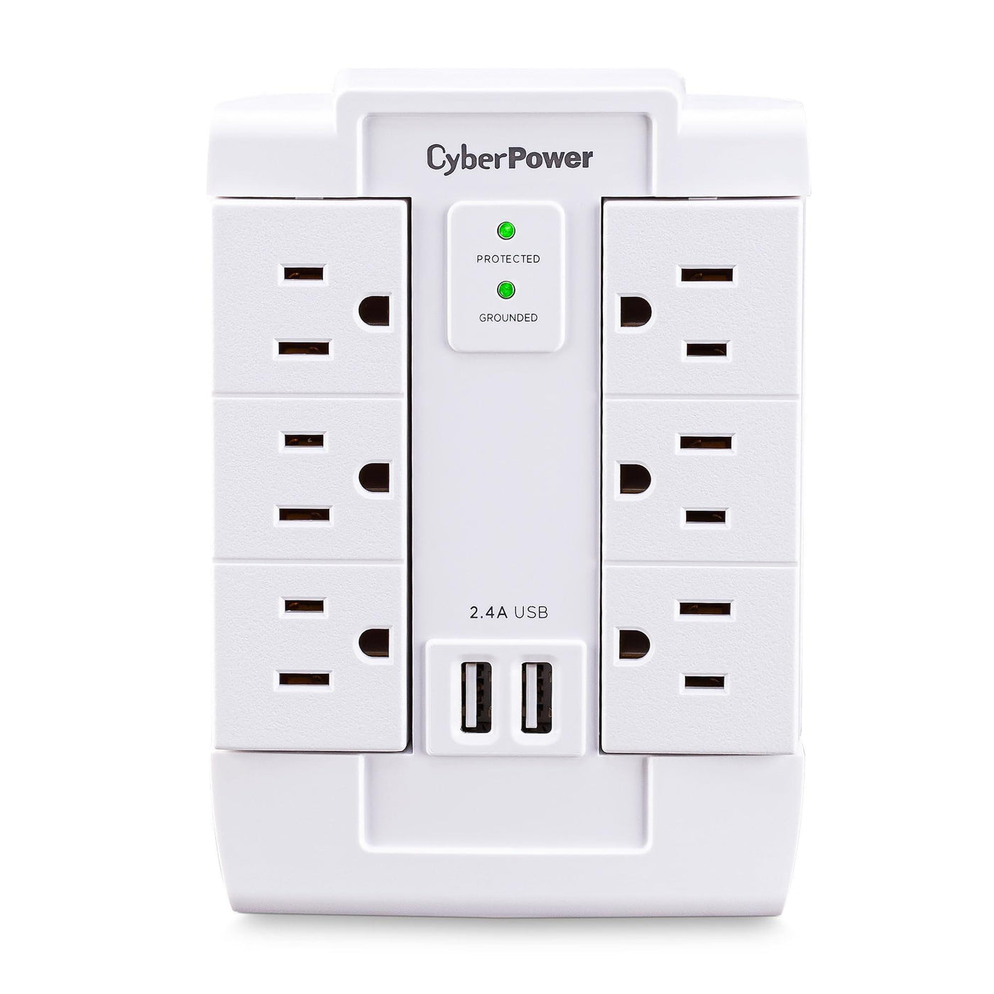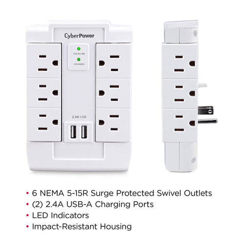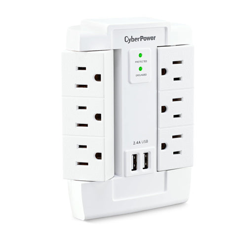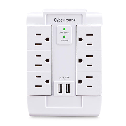 Details: The CyberPower Professional Series CSP600WSURC2 Surge Protector is ideal for Home/Office protection with 1200 joules, 6 swivel outlets, 2 USB charge ports (2.4 Amps shared), and a convenient wall tap design. The surge protector is ideal for protecting personal computers, phones/fax/modems, printers, stereos, and other electronics. Its two USB are perfect for keeping tablets, smart phones, and other rechargeable electronics ready to use. The CSP600WSURC2 features six outlets, wall tap plug, MOV technology to guard the surge protector and connected electronics against line abnormalities and lightning surges, while EMI/RFI filters block unwanted line noise. This surge protector comes with a 1 Year Limited Warranty and a $75,000 Connected Equipment Guarantee.