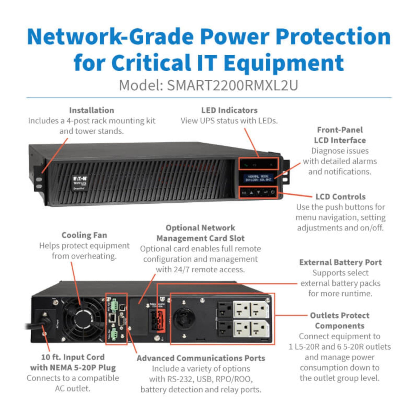 Details: 1.95kVA/1.95kW/120V Battery Backup for Distributed IT, Telecom or Enterprise Deployments: This rack-mount line-interactive UPS system provides reliable battery backup and AC power protection against blackouts, brownouts, surges and line noise that can damage your IT equipment or destroy data. The SMART2200RMXL2U is ideal power management for high-end in-rack networking equipment, including servers, VoIP phones, data storage and PoE switches. Unity power factor ensures the most watts possible at each power rating, so you can connect more equipment. Reliable, Expandable Battery Backup Keeps You Operational Through Power Outages: The field-replaceable, hot-swappable VRLA battery modules allow you to work through short power failures and give you enough time to safely save files and shut down your system in case of a prolonged blackout. Switchover from line to battery power happens within milliseconds to maintain continuous operation of connected equipment without interruption or rebooting. Extra runtime is available by connecting up to four optional extended battery modules (BP72VRM2U, sold separately). Optional LX Platform Network Management Card Allows Remote Access 24/7: The WEBCARDLXE network interface (sold separately) enables full remote configuration and management, including load shedding, reboots of connected equipment and safe shutdowns. The IP-based Auto Probe feature ensures continuous network uptime by communicating with other network devices, detecting lost connectivity and automatically rebooting IT equipment. Optional EnviroSense2 modules (E2MT, E2MTDO and E2MTHDI, all sold separately) provide a variety of environmental monitoring and control options. NEMA Outlets Protect Your Connected Components: One L5-20R and six 5-20R managed outlets provide connected equipment with pure sine wave AC output and allow you to monitor power consumption down to the outlet group level. Power provided by these outlets is filtered to protect connected equipment against damaging surges and line noise. Four 5-20R outlets are split into two independently switchable load banks that let you shed non-critical loads to extend runtime for critical loads. Front and rear cooling fans help protect equipment from overheating. Automatic Voltage Regulation (AVR) Corrects Low- and High-Voltage Conditions: AVR protects your equipment from incremental hardware damage, data loss and performance problems caused by brownouts. The SMART2200RMXL2U maintains regulated 120V nominal output during brownouts and overvoltages from 80V to 151V while keeping the battery fully charged and ready to take over in case of power failure. Premium Protection from EMI/RFI Line Noise Helps Your Equipment Perform Better: This UPS system filters out disruptive electromagnetic and radio frequency interference that can inflict hardware damage or data loss. This EMI/RFI filtering also helps your connected components perform better and last longer. ENERGY STAR-Certified to Help You Save Money and Protect the Environment: By meeting strict U.S. Department of Energy and U.S. Environmental Protection Agency requirements, this ENERGY STAR 2.0 UPS system provides high operational efficiency to signal a reduction in BTU emissions, save on utility and cooling costs and help protect the environment. Intuitive Front-Panel Interface for Convenient UPS Operation and Monitoring: The two-line front-panel LCD monitoring screen features ten selectable screens that allow quick access to a wide range of detailed UPS and site power information. LEDs show UPS status: a green light means utility power is on, an orange light means the UPS is in battery mode and a red light indicates an active alarm or fault. The control panel rotates to accommodate both rack-mount and tower configurations. Advanced Communications Ports Allow for Automatic Saves and Shutdowns: RS-232 and USB ports connect to a device for a variety of communication options (cables are included). A dry-contact relay port can be programmed through the LCD to provide reliable communications to automation and industrial components. The RPO/ROO port permits emergency shutdown or remote restart of all connected equipment. Versatile Installation Options: You can mount the SMART2200RMXL2U in just 2U of space in an EIA-standard 19-inch rack using the included hardware. At 23.7 inches deep, the UPS mounts in short-depth racks and other compact spaces. You can also adapt it for tower installation using the included support stands. The 10-foot power cord with NEMA 5-20P plug connects to a compatible AC outlet.