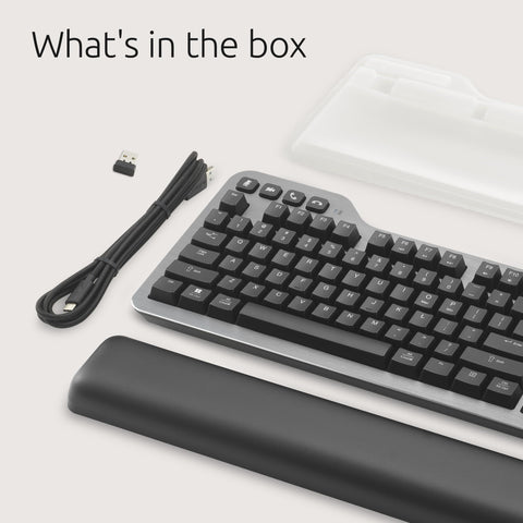 - Gel wrist rest, dust cover, charging/connecting cable, and wireless receiver included