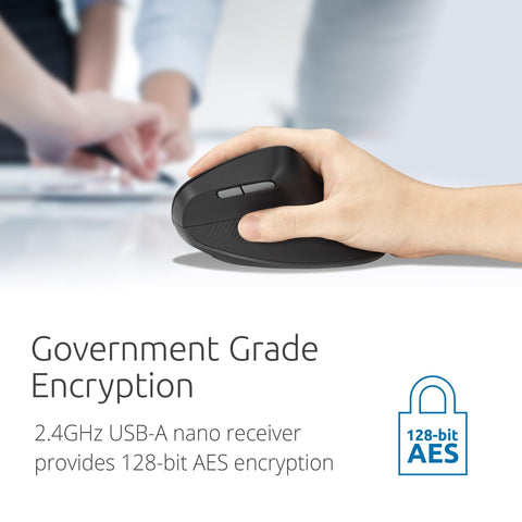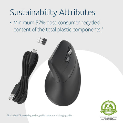 Details: The Pro Fit Ergo MY630 EQ Rechargeable Mouse is an ideal companion for busy professionals seeking a more sustainable solution delivering enhanced comfort and productivity. The vertical full-size design promotes improved wrist posture and enhanced control. It features multi-device connectivity, 57% postconsumer recycled (PCR) content of total plastic components*, a rechargeable battery, 5-programmable buttons, silent clicking, dongle storage, and AES government grade encryption.