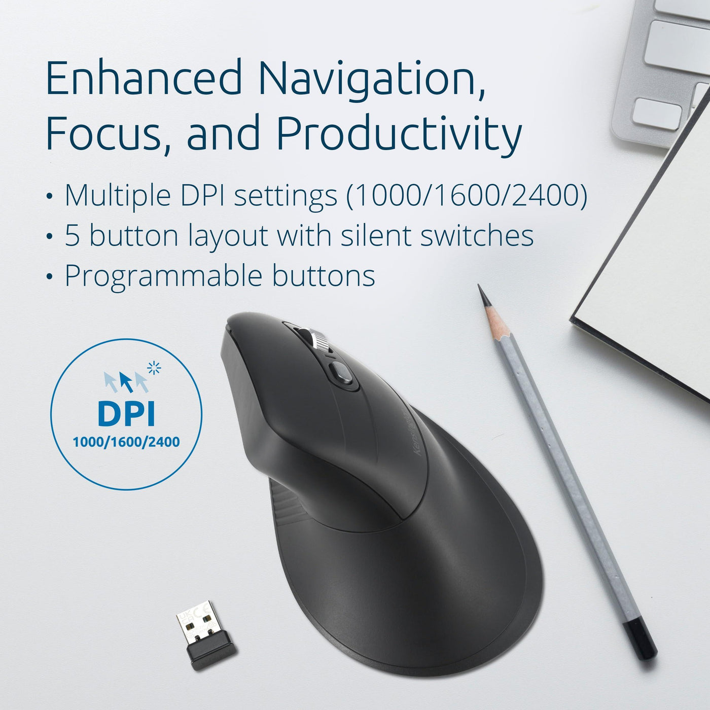 - 5-Button Navigation, Silent Switches, and DPI Button - Left, right, forward, back, and scroll/middle-click buttons enhance navigation and productivity. Silent switches support a quiet work environment, and a DPI switch (1000/1600/2400) allows you to adjust your cursor precision and sensitivity quickly.