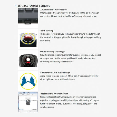 - Unique touch scrolling along with compact 32 mm ball lets you glide effortlessly through web pages and documents.