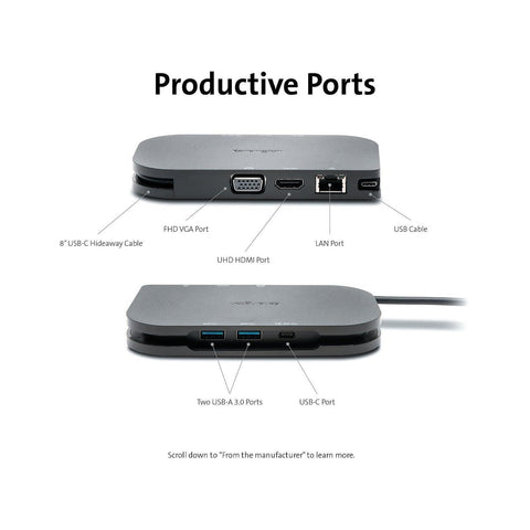Details: Kensington’s SD1610P USB-C Mobile 4K Dock with Pass-Through Charging was designed for Microsoft Surface. Users can expand their mobile or desktop setup to include a full HD (VGA) or 4K (HDMI) display and connect and charge their favorite USB accessories. Whether in a temporary workspace or a conference room, the SD1610P keeps users productive and powered up. Built on USB-C technology and Power Delivery 3. 0, users can connect with confidence to Microsoft Surface Go, Microsoft Surface Book 2, Microsoft Surface Laptop 3, Microsoft Surface Pro 8 and 7 and Microsoft Surface Pro X knowing the SD1610P will let them expand their workspace, use their favorite accessories, and power their Surface at the same time . 3A/60W (or higher) USB-C charger required (not included)