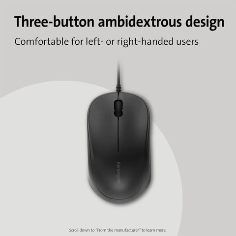 - Three-button ambidextrous scroll wheel mouse provides a comfortable experience for left- or right-handed users