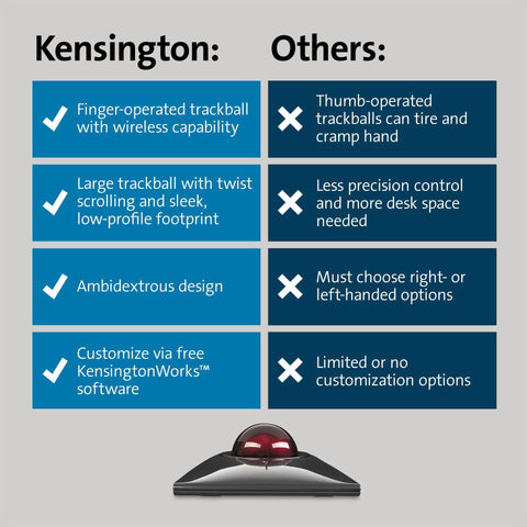 Details: Professional reviewers and ergonomists agree that finger-operated trackballs are superior to thumb-based trackballs when it comes to precision and hand comfort. At the same time, professional users prefer the convenience of wireless controllers. Kensington has responded with its most advanced trackball yet: the SlimBlade™ Pro Trackball. Now you can enjoy the precision and ease of a finger-operated trackball that includes Bluetooth, 2.4GHz wireless and wired capabilities, as well as unique dual-sensor ball-twist scrolling. All in a sleek design that saves valuable desk space and can be used with either hand. It’s the ultimate in accuracy, comfort, and control.