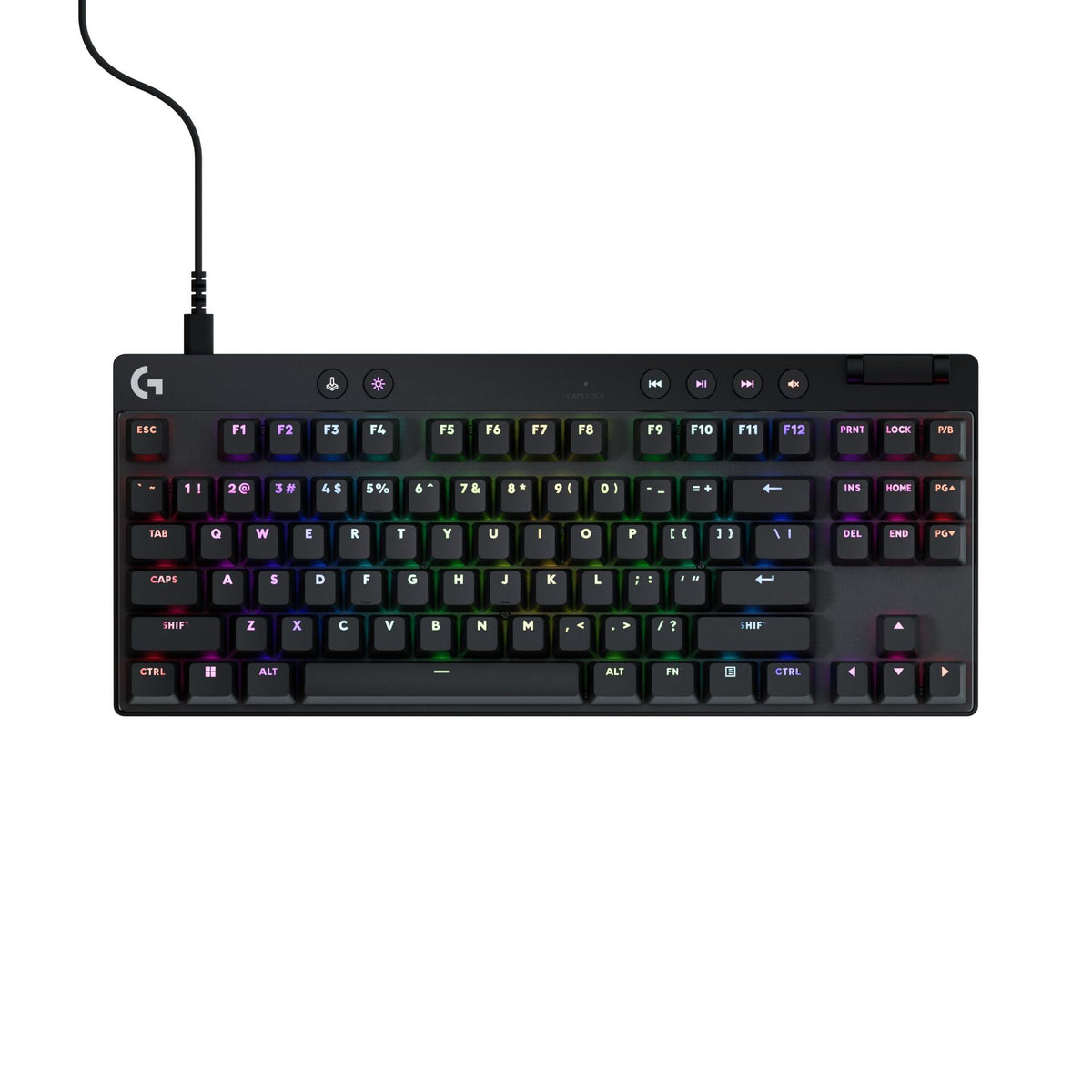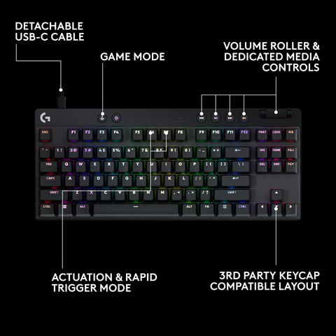 Details: Elevate your gaming with the cutting-edge Logitech G PRO X TKL RAPID Wired Gaming Keyboard featuring magnetic-analog key switches. This gaming key board offers responsiveness with Rapid Trigger and allows you to configure the switch travel on the fly without software, or use Logitech G HUB for precise key control. Enjoy your experience with this RGB keyboard as it dynamically syncs to the on-screen action. LIGHTSYNC RGB lighting enables color customization of any key to your liking. KEYCONTROL allows you to set specific commands or build multi-action combos across multiple layers on every single key. The durable dual-shot PBT keycaps and tenkeyless layout give this gamer keyboard a great feel and provide undistracted play. The Logitech G PRO X TKL Keyboard comes with dedicated media controls and a detachable USB-C cable. This black gaming keyboard is great for players seeking precision and style. Choose the Logitech G keyboard for your enhanced gaming setup, benefitting from features that this keyboard for gaming offers. The sleek black keyboard design complements any gaming environment, making it a must-have for dedicated gamers.