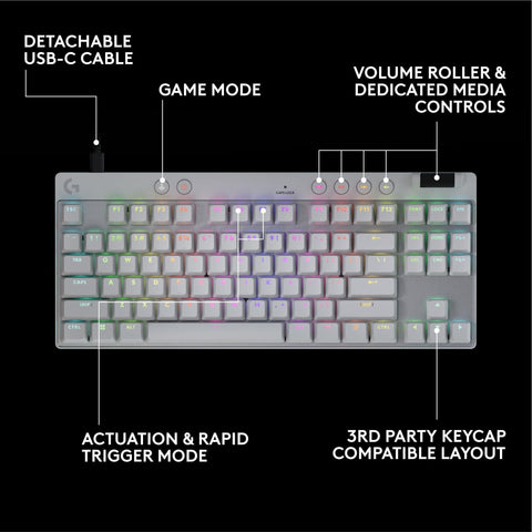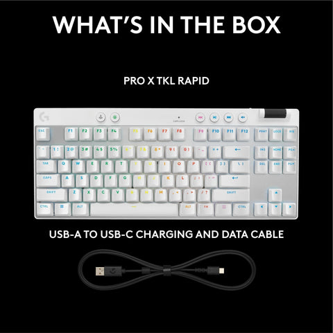 Details: Elevate your gaming with the cutting-edge Logitech G PRO X TKL RAPID Wired Gaming Keyboard featuring magnetic-analog key switches. This gaming key board offers responsiveness with Rapid Trigger and allows you to configure the switch travel on the fly without software, or use Logitech G HUB for precise key control. Enjoy your experience with this RGB keyboard as it dynamically syncs to the on-screen action. LIGHTSYNC RGB lighting enables color customization of any key to your liking. KEYCONTROL allows you to set specific commands or build multi-action combos across multiple layers on every single key. The durable dual-shot PBT keycaps and tenkeyless layout give this gamer keyboard a great feel and provide undistracted play. The Logitech G PRO X TKL Keyboard comes with dedicated media controls and a detachable USB-C cable. This black gaming keyboard is great for players seeking precision and style. Choose the Logitech G keyboard for your enhanced gaming setup, benefitting from features that this keyboard for gaming offers. The sleek black keyboard design complements any gaming environment, making it a must-have for dedicated gamers.
