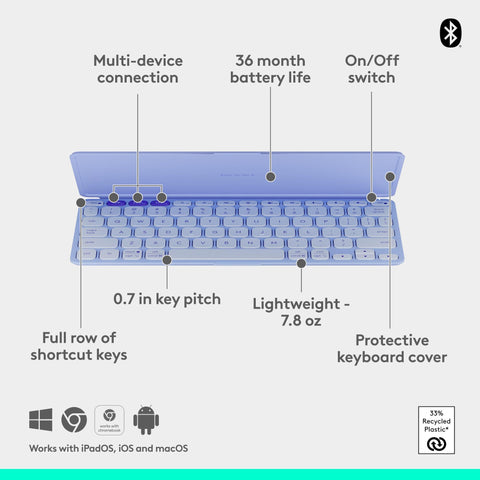Logitech Keys-to-GO 2 Portable Bluetooth Tablet Keyboard with Built-in Cover, Slim & Compact Wireless Keyboard for Windows, Android, Linux, iPad, iPhone, Mac, Apple TV - Lilac Sale