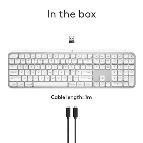 Details: Logitech MX Keys S for Mac, a low-profile full-size Bluetooth keyboard, designed for Mac, with a Mac key layout and Apple-specific colorways. MX Keys for Mac offers a fluid, precise typing experience and customizable, time-saving Smart Actions that automate your most repetitive tasks with a single keystroke. The Logitech wireless keyboard features smart backlighting that lights up when your hands approach it and automatically adjusts to suit the time of day. Conveniently create and customize Smart Actions, adjust illumination brightness and duration, check battery life, and assign app-specific profiles with the Logi Options+ app (1). Product Details: Weight: 810 g Dimensions : 20.5 x 430.2 x 131.63 mm Compatible with macOS, iOS(4), iPadOS(4) operating systems Rechargeable Li-Po (1500 mAh) battery Optional Customization app(1): Logi Options+ Important: FileVault might be enabled on your macOS computer, which could prevent you from entering your password at start or reboot when connected to Bluetooth. In this case, use Logi Bolt USB Receiver (not included).