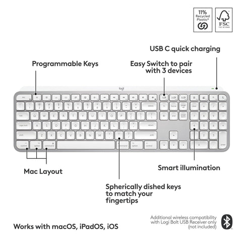 - Made With Recycled Plastic: Plastic parts in Logitech MX Keys S for Mac include certified post-consumer recycled plastic 26% for Space Gray and 11% for Pale Grey (5)