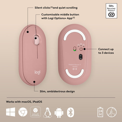 Logitech Pebble Mouse 2 M350s Slim Bluetooth Wireless Mouse, Portable, Lightweight, Customizable Button, Quiet Clicks, Easy-Switch for Windows, macOS, iPadOS, Android, Chrome OS - Tonal Rose