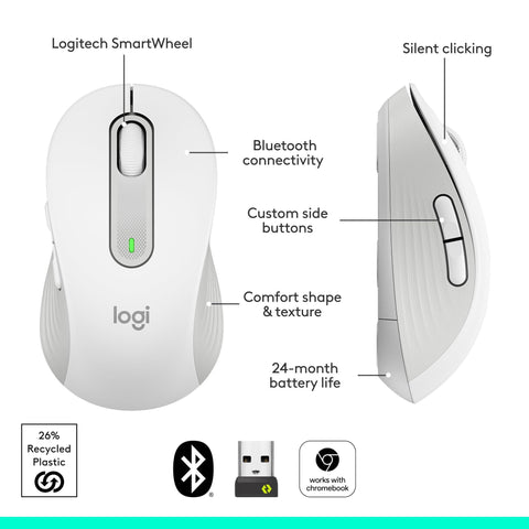 Details: Upgrade to smarter scrolling, better comfort, and more productivity with the Signature M650 L wireless computer mouse. The versatile Logitech bluetooth mouse features an adaptive scroll SmartWheel that delivers line-by-line precision and auto-switches to super fast free spin mode with the flick of a finger. A choice of sizes for smaller, larger and left hands means there's a cordless mouse for anyone. With seamless wireless connectivity, Bluetooth options, customizable side buttons, and a comfortable shape, this wireless mouse keeps you productive and comfortable hour after hour. Logitech’s SilentTouch technology delivers silent clicks to keep you focused – while 24-month battery life and universal operating system compatibility ensure hassle-free performance. Battery life may vary based on user and computing conditions.