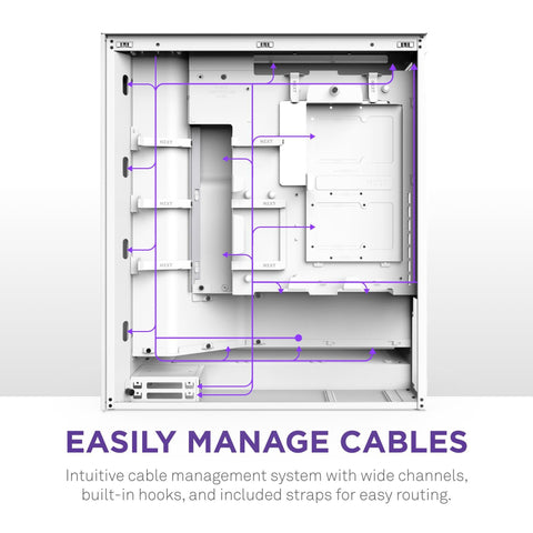 - EASILY MANAGE CABLES — Intuitive cable management system with wide channels, built-in hooks, and included straps for easy routing.