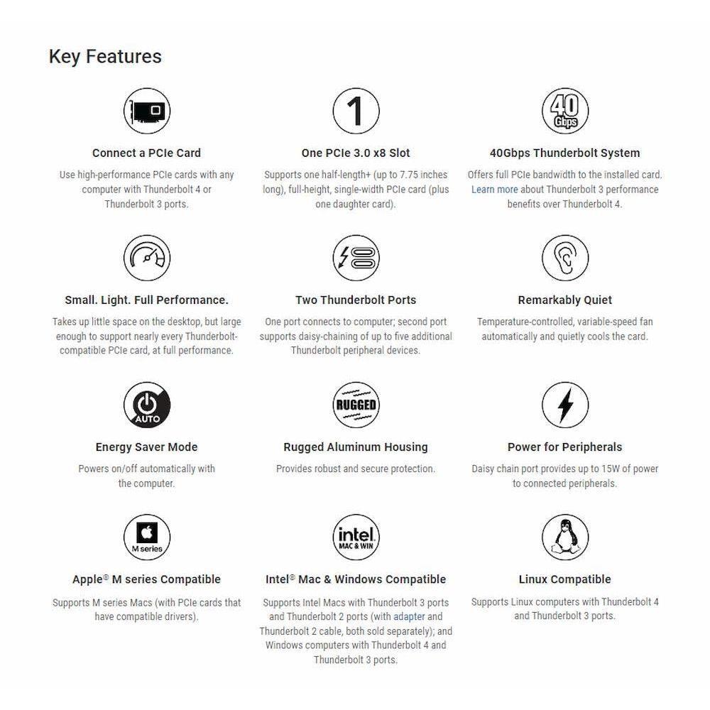 - Full Performance In a Small and Light Design—Takes up little space on the desktop, but large enough to support nearly every Thunderbolt-compatible PCIe card, at full performance