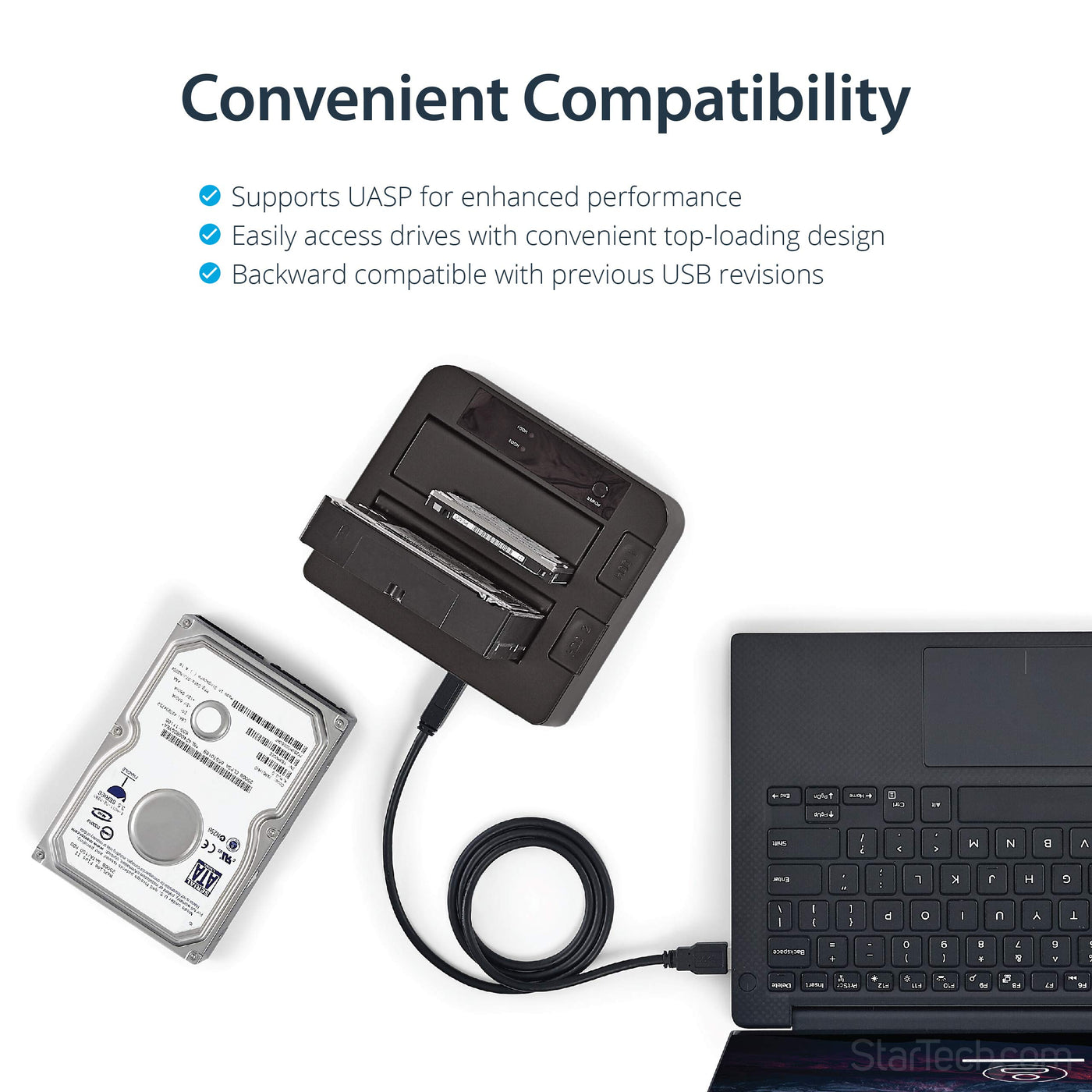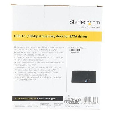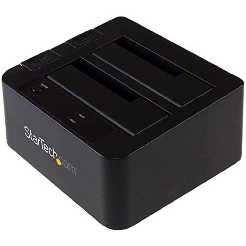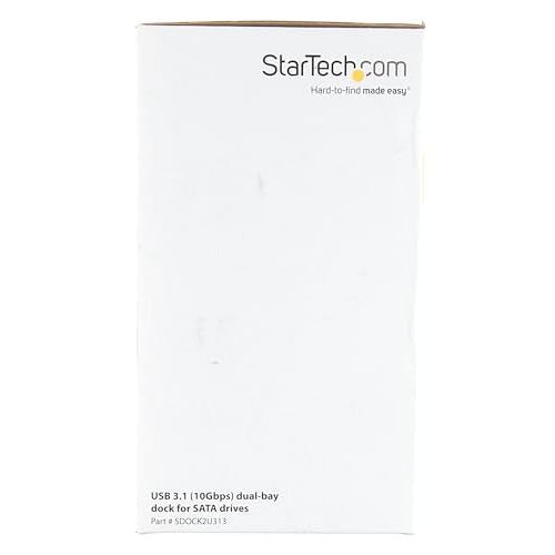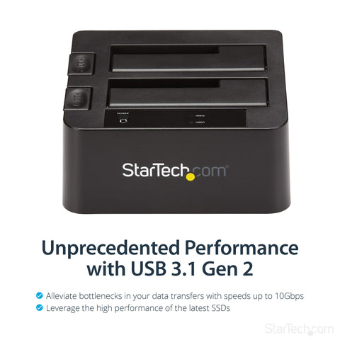 Details: Get unprecedented performance and storage capacity with this USB 3.1 Gen 2 (10Gbps) SATA hard drive docking station. It supports both 2.5" and 3.5" form factor solid-state and hard drives, with a high capacity storage capability of 12TB (6TB per drive). Harness the Speed of USB 3.1 Gen 2 The multiple hard drive docking station features USB 3.1 Gen 2. It gives you greater bandwidth and speed with file transfer rates of up to 10Gbps. The hard drive bay lets you leverage the high performance of the latest SSDs and HDDs, while alleviating bottlenecks in your data transfers. Top-Loading Design for Easy Drive Access Simply insert your drives into the top loading slot of the SATA to USB dock, with no tools or trays required. The HDD ejection button on the USB 3.1 hard drive dock allows fast and simple drive removal. Convenient Compatibility The external dual hard drive docking station comes with a USB Type-A to B cable, providing backward compatibility with your existing USB 3.0, 2.0 and 1.x devices. The USB hard drive bay duplicator dock also supports UASP for enhanced performance. Extend the value of this HDD/SSD docking station further with the addition of our SATA to IDE Hard Drive Adapter (SAT2IDEADP), allowing easy insertion of any 2.5" or 3.5" IDE hard drive into a SATA hard drive dock. The USB to SATA dock is backed by a StarTech..