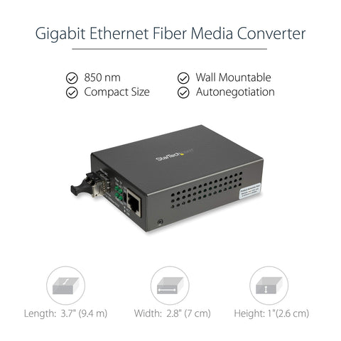 Details: This LC fiber media converter offers an easy way to extend your network over Gigabit fiber (with a maximum data transfer rate of 1000 Mbps in full duplex mode). It is equipped with a multimode SFP (mini-gbic) transceiver which converts a copper RJ45 Ethernet connection to Gigabit fiber to extend your network over longer distances or connect workstations to switches. The converter supports full duplex operation, LinkFault Pass through (LFP), Auto MDIX and 9K jumbo frames, and provides a powerful extended networking solution for campuses, businesses, government facilities, stadiums or other areas requiring network access. The Gigabit fiber media converter provides a cost-effective solution for shorter range network extensions. It connects an Ethernet network to remote devices over a fiber backbone, with a 550m / 1804ft range on the fiber optic interface. This high performance media converter has a durable metal housing, engineered to deliver long-lasting performance - perfect for IT and business professionals. Fully compatible with 10/100/1000Base-T Ethernet networks (with a maximum data transfer rate of 1000 Mbps (1 Gbps)), the converter supports auto negotiation to bridge different speed networks and devices to a Gigabit fiber network. It provides versatile connectivity to your existing networks and devices, allowing you to maximize the usage and performance of legacy equipment. The included Multimode SFP transceiver is removable, giving you the flexibility to change your transceiver in the future to meet your networking needs. The unmanaged fiber media converter has a standalone design with simple plug and play set-up to ensure fast and easy installation. Compact in size, the converter gives you flexible installation options - including a wall mounting option to save space. This 10/100/1000 Mbps Multimode fiber media converter is backed by a StarTech..
