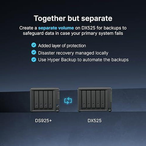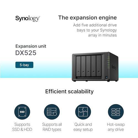 - **Compatibilty Note: The DX525 is only compatible with newer Synology NAS devices equipped with a USB-C expansion port. See official compatibility list for supported models and drives.