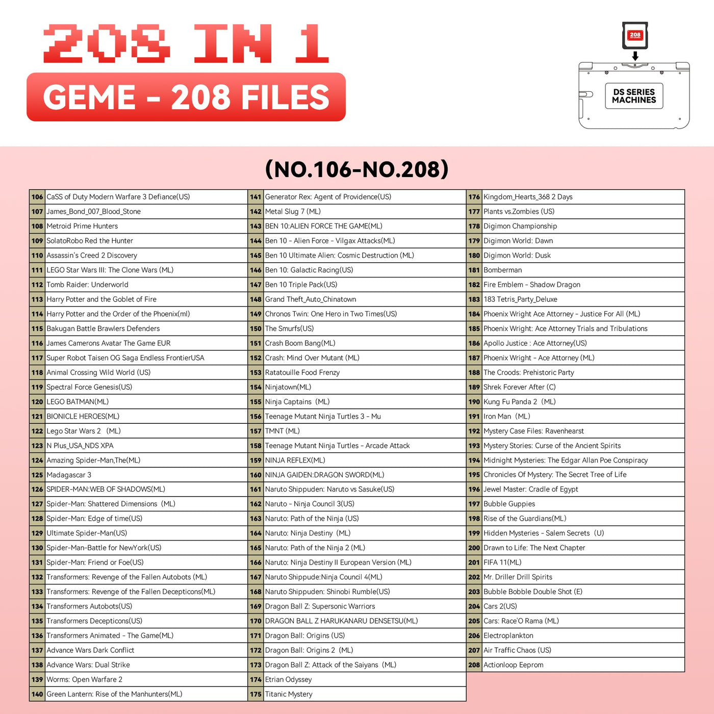 - 【Super Game Feast】208 in 1 Game Cartridge is a super game set for game fans. 208 games of different popular genres are available to meet any of your gaming needs. Each game can save the progress of the game. Comes with a beautiful case protector.