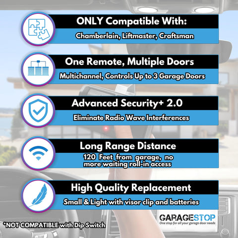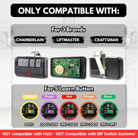 - Wide Compatibility – The Garage Door Opener Remote works with Chamberlain, LiftMaster, and Craftsman models from 1993–present. Supports all 5 Learn Button colors. *NOT Compatible with DIP switch, MyQ, Genie, or Overhead models.